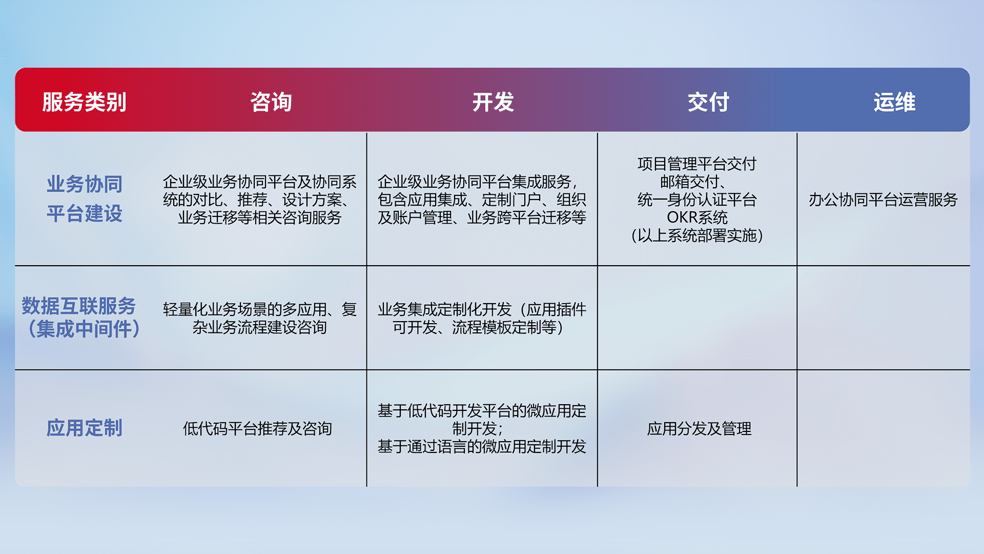 针对钉钉、、、企微、、IDaas等平台级产品提供产品的规划、、方案、、、交付、、、定制化开发等服务,,实现如统一协同办公、、、智能客户服务、、混合会议管理、、、智能数据查询、、、等业务场景,,,,实现数字化转型。。。
